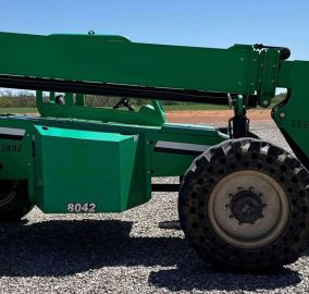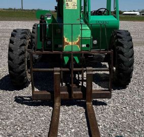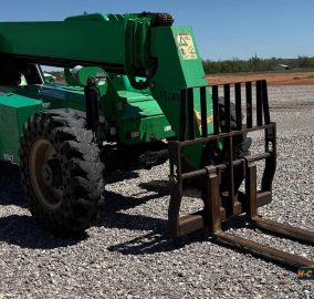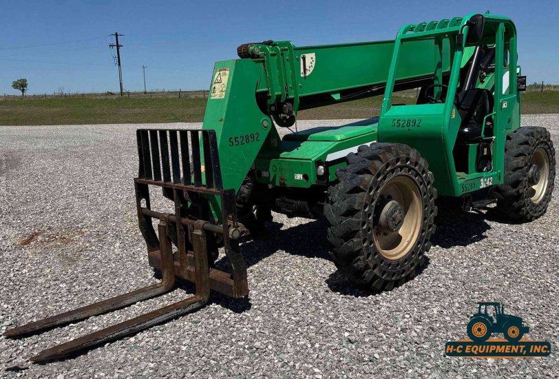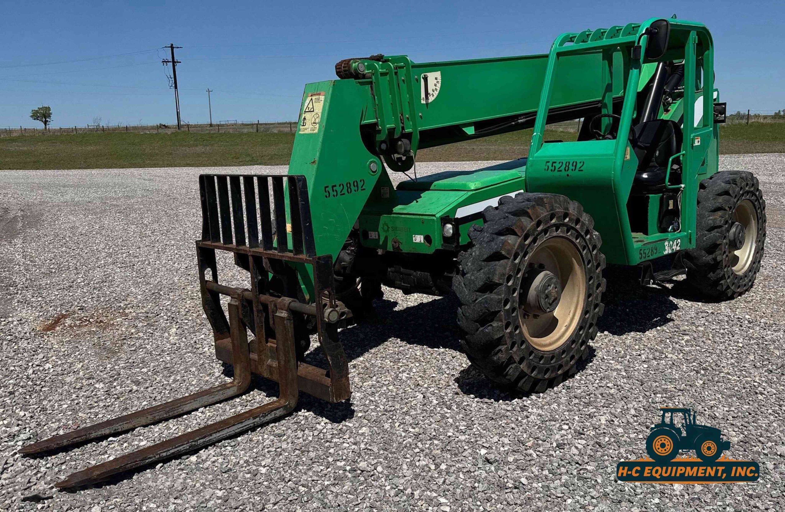 The 2013 JLG Skytrak 8042 is a versatile telehandler designed for lifting heavy loads at heights. It features a 8,000 lb maximum lift capacity, a 3-stage boom, and manual quick attach for ease of switching attachments. Powered by a 3.2L Cummins QSB3.3 diesel engine, it is equipped with a powershift transmission and four-wheel drive, making it ideal for rough terrain. The machine also includes auxiliary hydraulics, crab steering, and solid 13.00-24/8.50 tires for enhanced stability and performance on job sites.