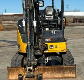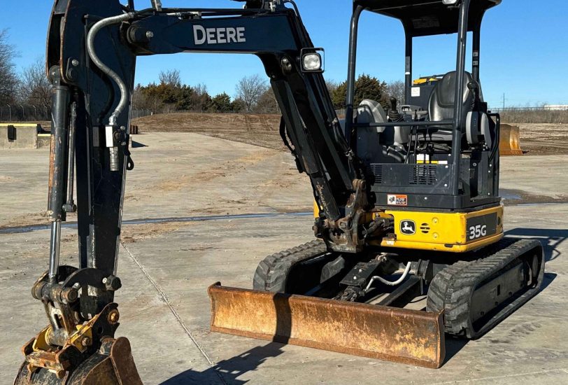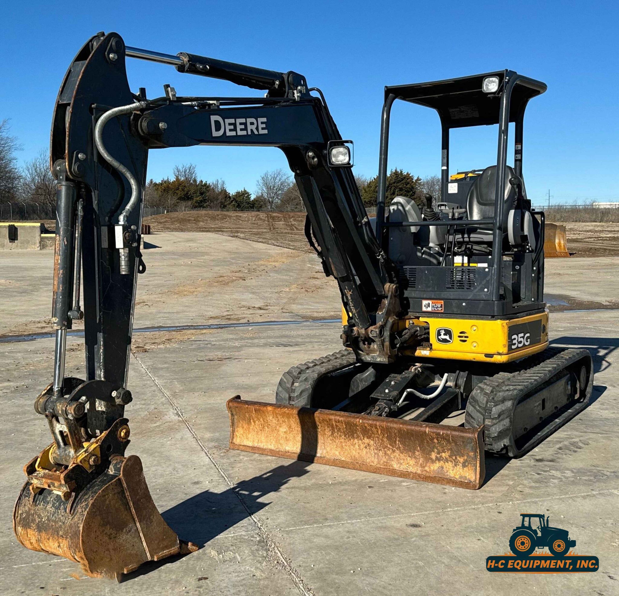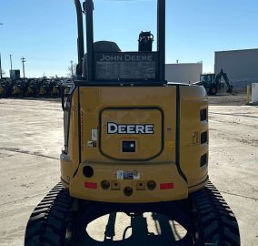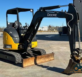 The 2020 John Deere 35G mini excavator is a compact, efficient machine with 24.8 horsepower, designed for high performance in tight spaces. Powered by a Yanmar diesel engine, it features a hydrostatic transmission with two-speed travel for smooth operation. The OROPS (Open Rollover Protective Structure) cab ensures safety, while the excavator is equipped with auxiliary hydraulics, a backfill blade, and a 53" stick. The 17" bucket with a welded cutting edge and four teeth is ideal for digging, and the 11" rubber tracks provide excellent traction on various surfaces. Perfect for small construction, landscaping, and utility work, the 35G combines power with maneuverability.